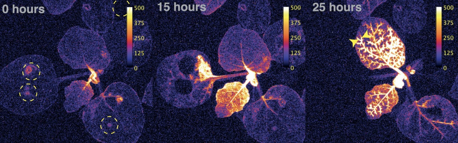 Gracias a la ingeniería genética, esta respuesta ahora se puede ver: la planta emite un brillo fluorescente que marca exactamente dónde y cuándo está ocurriendo el estrés.